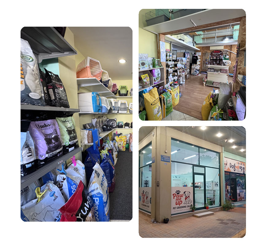 Στο κατάστημά μας βρίσκεις τα καλύτερα προϊόντα που υπάρχουν για τα κατοικίδια ζώα, καθώς και υπηρεσίες κομμωτηρίου – grooming, ακριβώς δίπλα στο Paw Me Up!